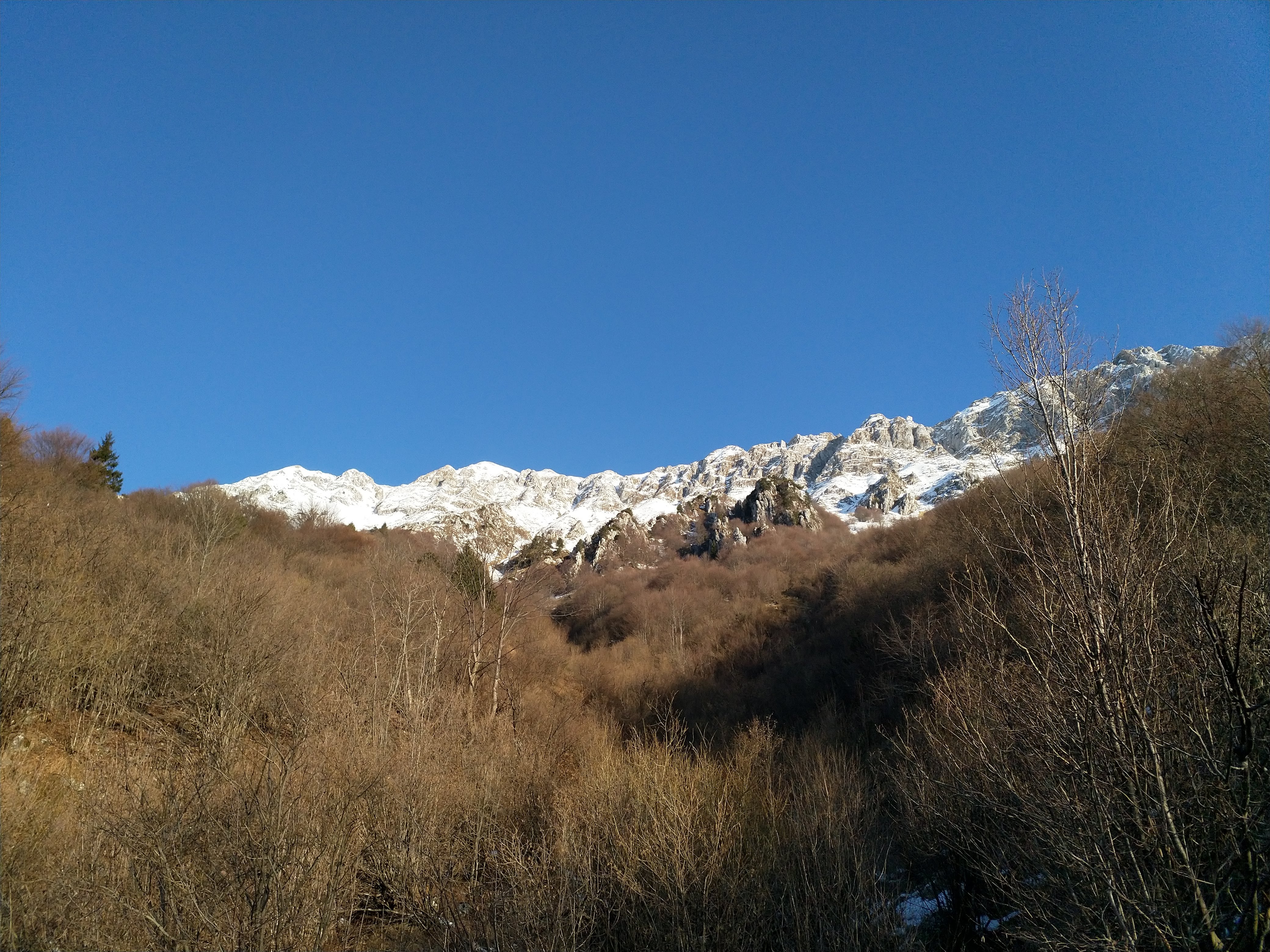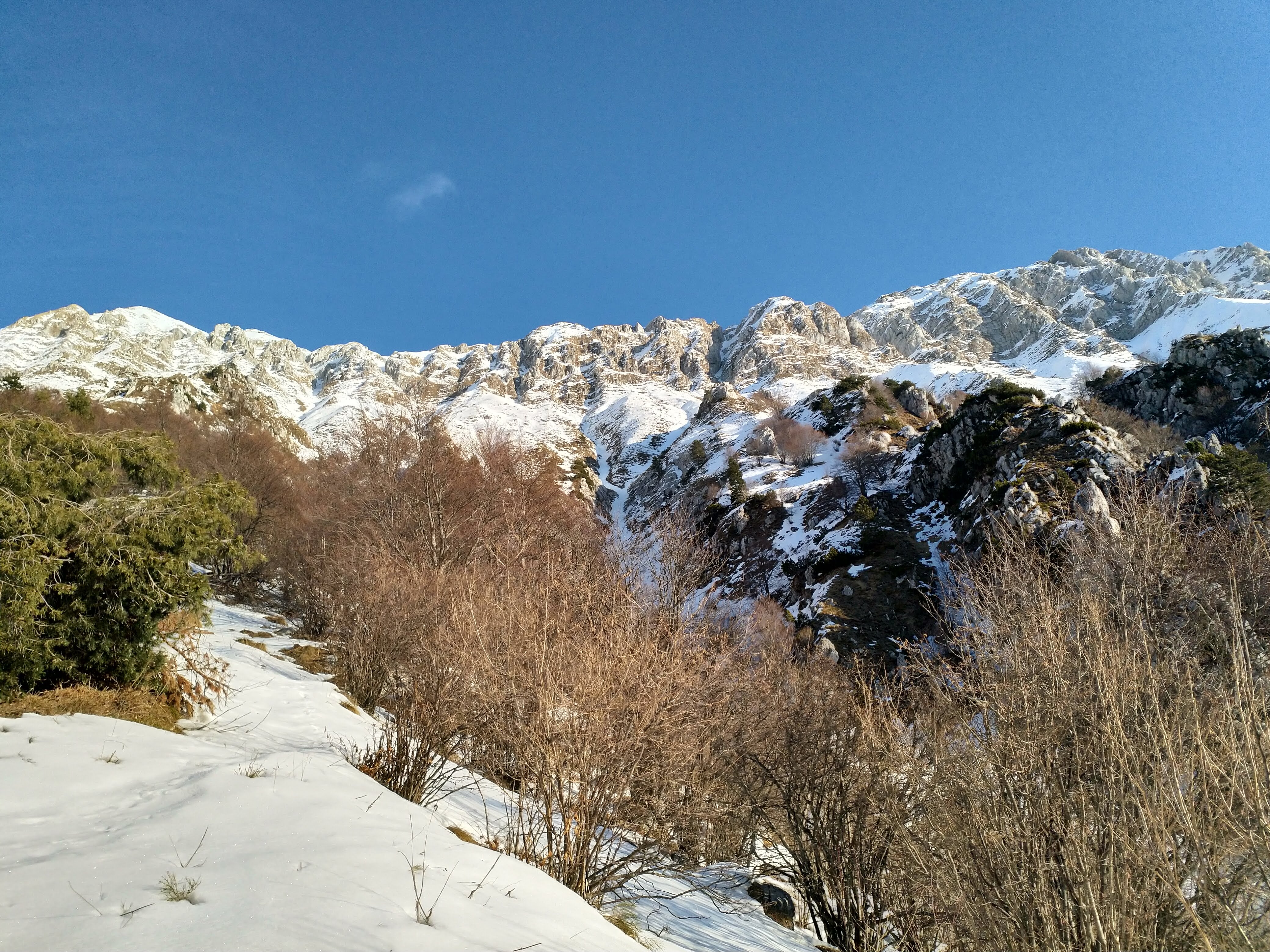 Superato il letto di un torrente si entra in un bosco di noccioli che continuerà fino alla quota in cui lascerà spazio ai prati e poi alle rocce sommitali. Il sole sale rapido e nonostante i raggi bassi il terreno inclinato ne riflette il calore rendendo l’aria molto calda.