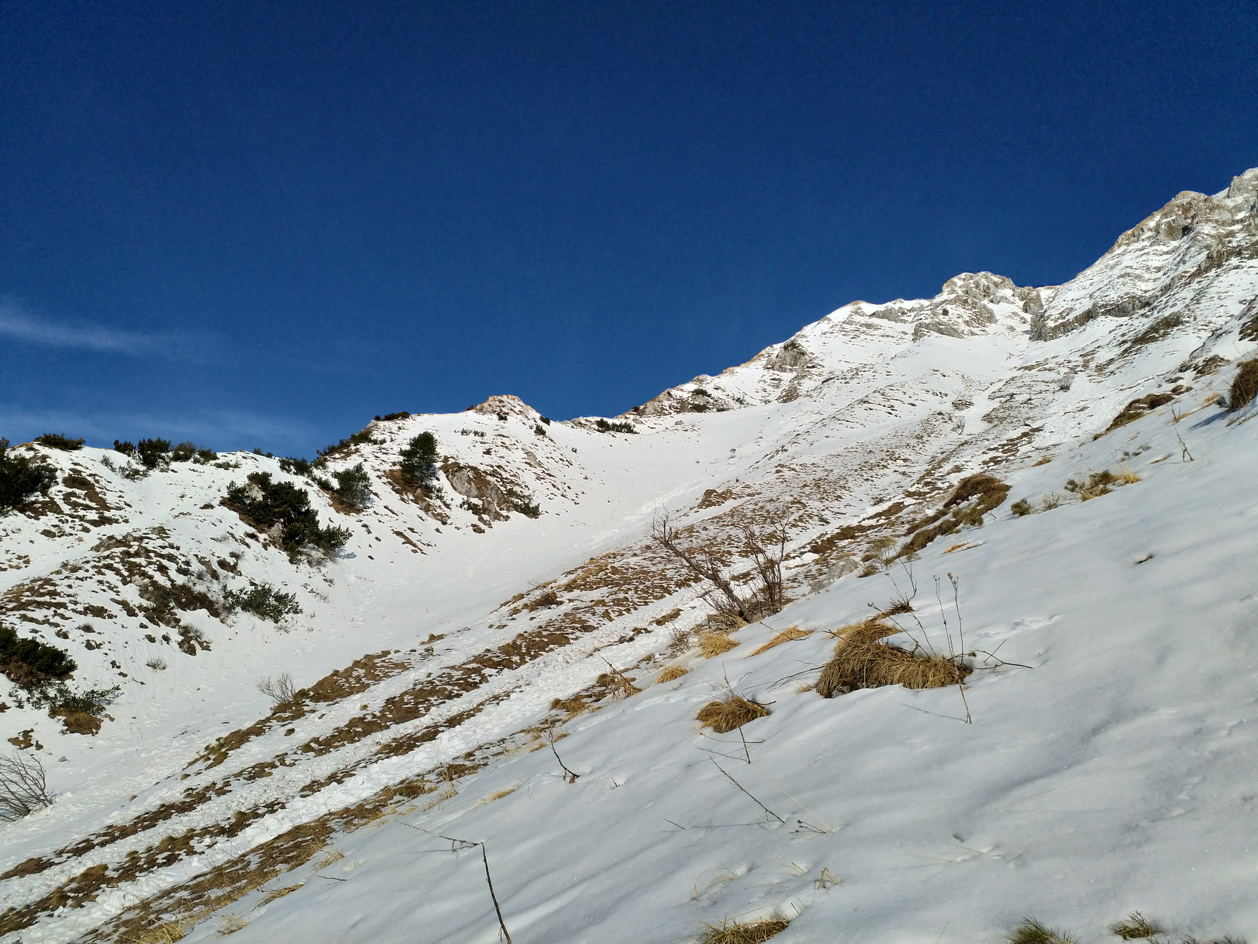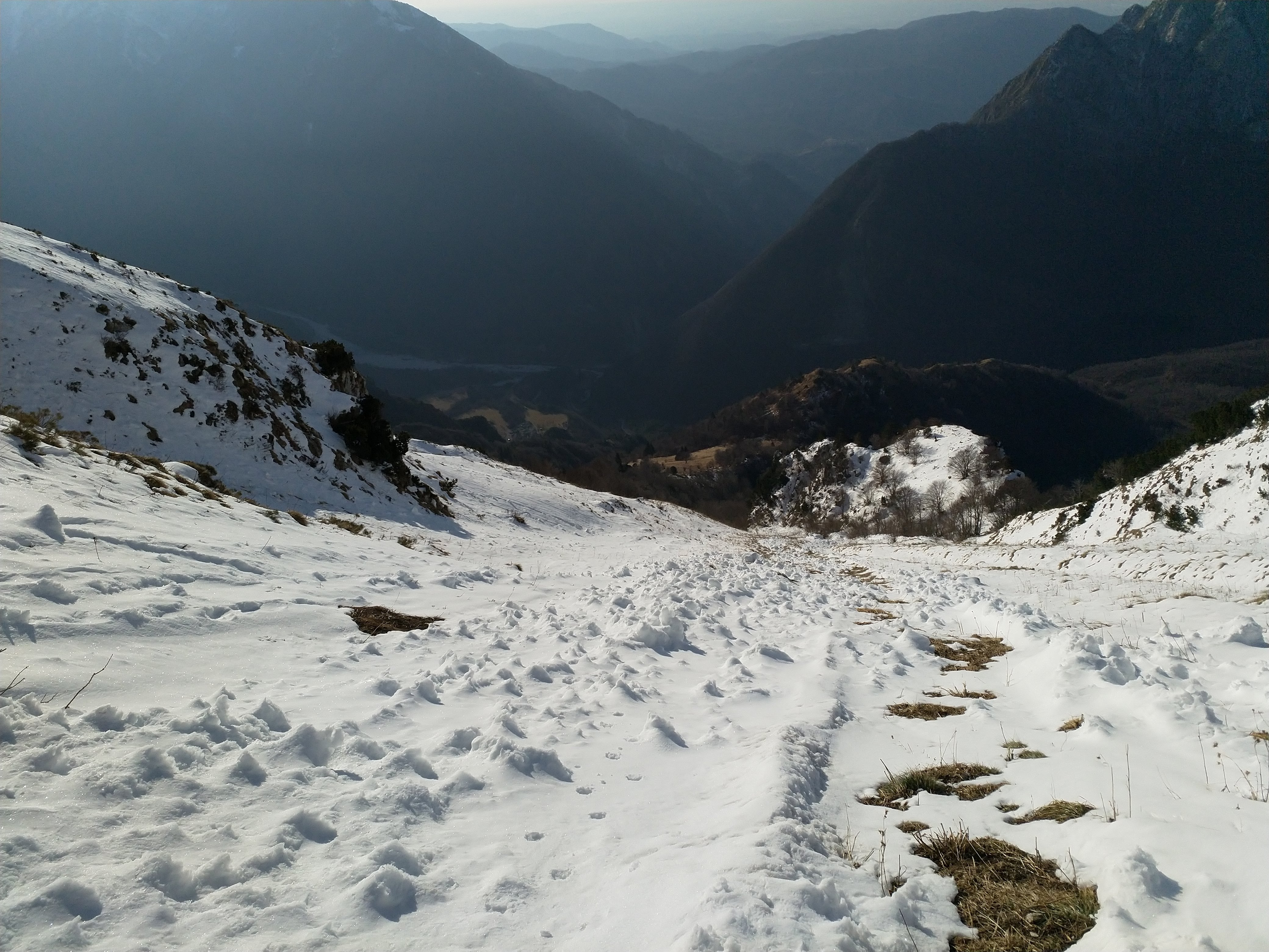Superato di slancio il boschetto, appena iniziano i prati, trovo anche la prima neve: le rade chiazze sono lastre ghiacciate create dal calore del sole e dal freddo della notte. Nei canali che discendono dalle varie vette si notano subito gli accumuli e i violenti effetti delle slavine.