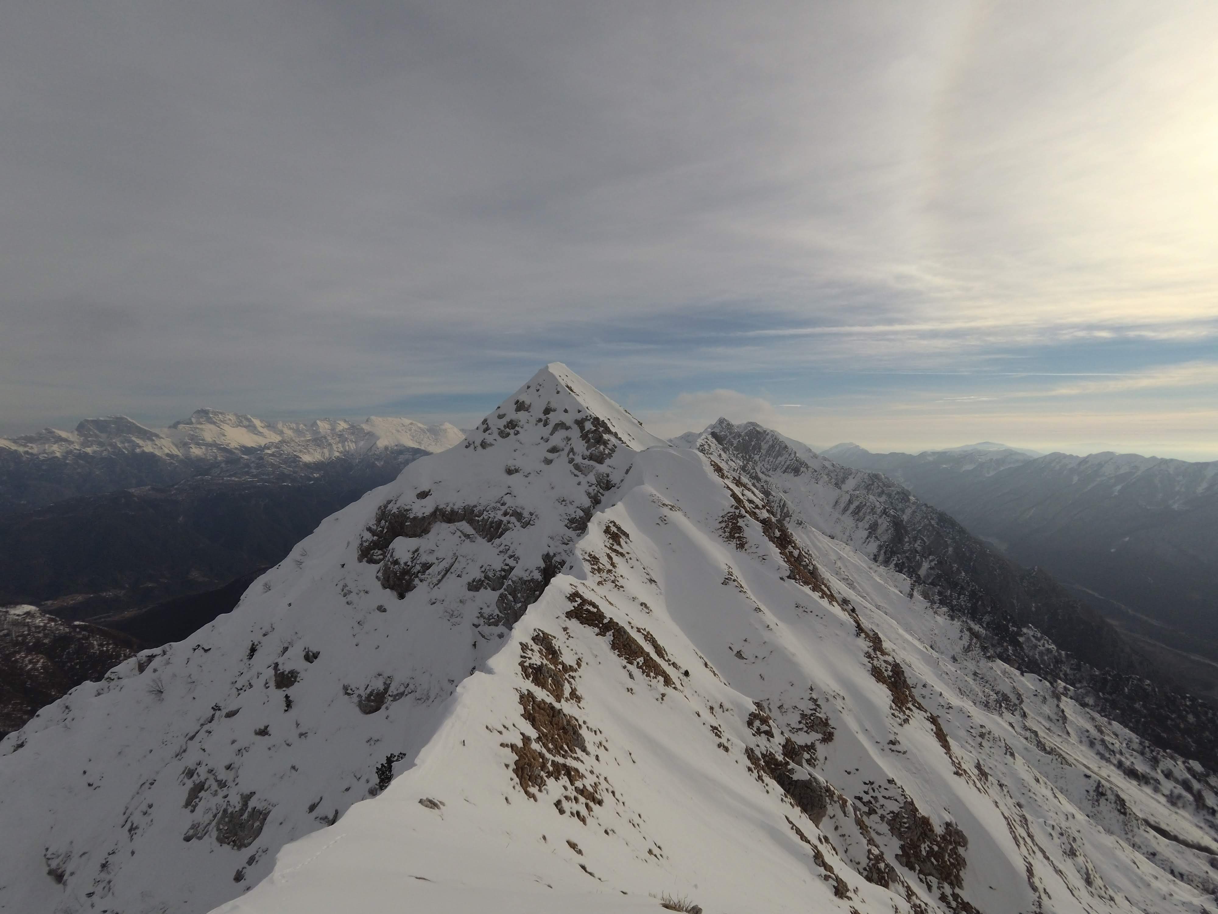 Le pareti rocciose dei due lati della montagna si fanno sempre più ripide fino ad incontrarsi e creare una cresta sottile come una lama resa ancora più affilata dalla neve modellata dal vento.
