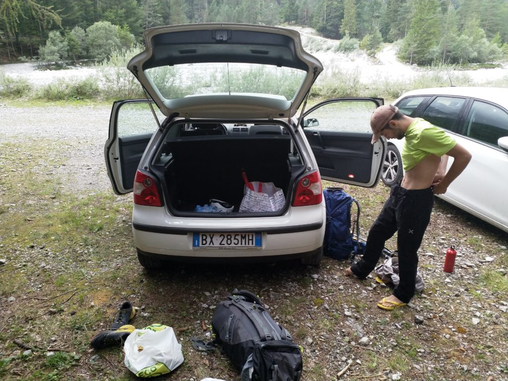 Le previsioni meteo non promettono molto bene, ma partiamo comunque eccitati e carichi come muli per affrontare i 900 metri di dislivello che ci separano dalla meta della giornata: Casera Laghet de Sora.