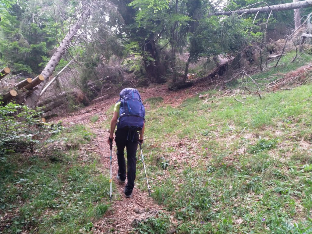 L’aria umida, gli zaini pesanti e il sentiero da poco ripulito dai moltissimi alberi crollati sotto la forza del vento e dell’acqua, ci costringono a sudare e a conquistare pian piano le ripide salite.