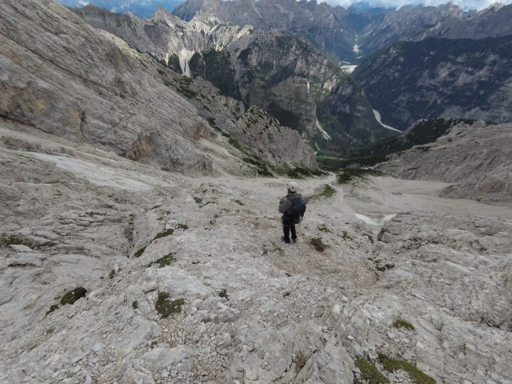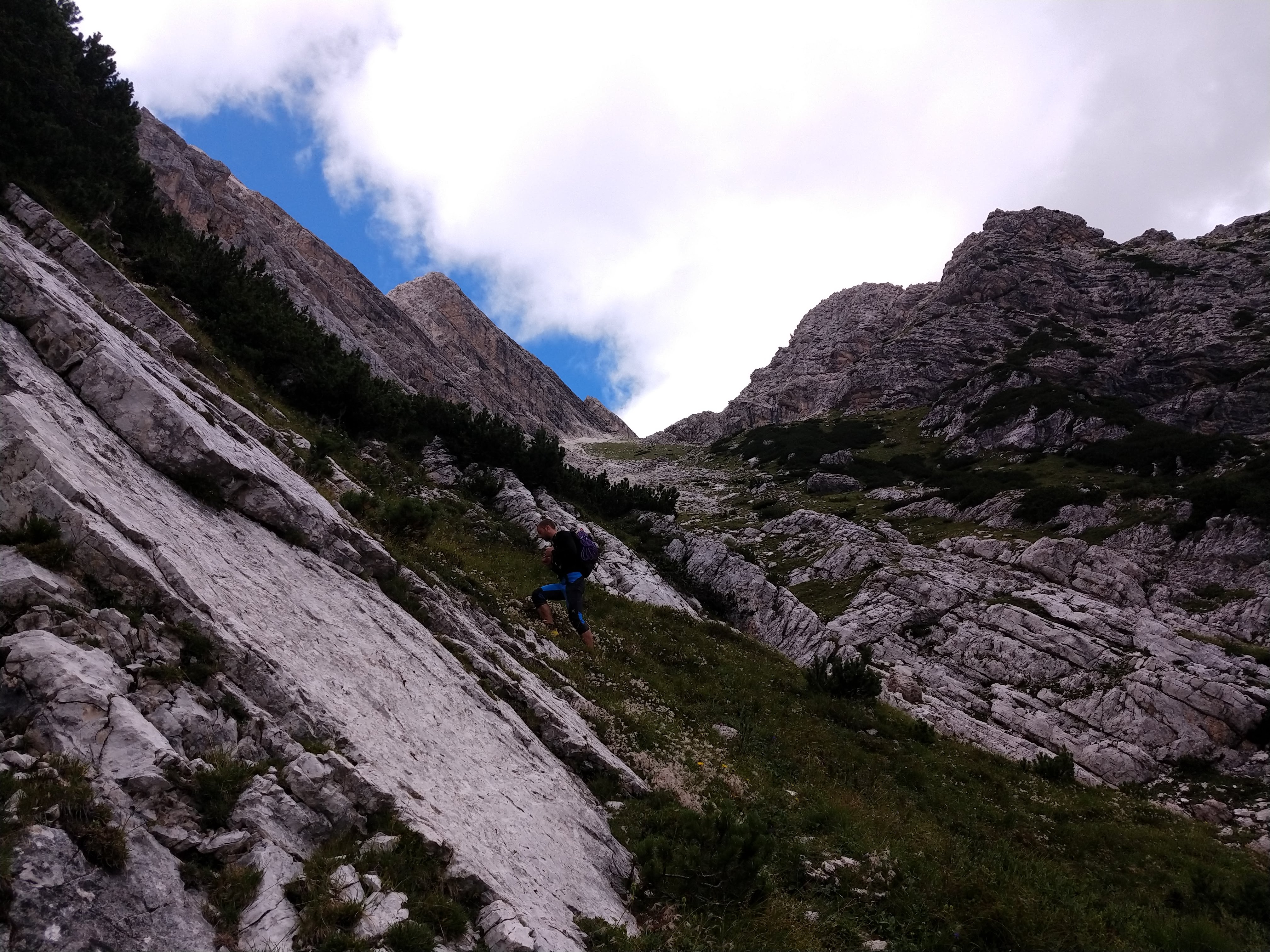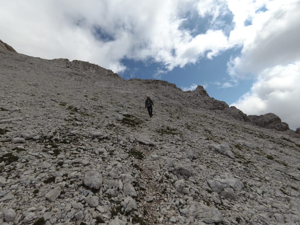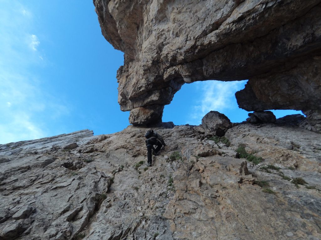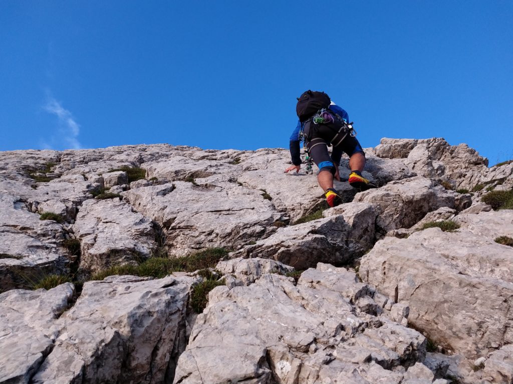 Le cosce si contraggono guadagnando quota lungo il sentiero che punta dritto alla muraglia rocciosa. La stanchezza e la voglia di poter terminare il giro nel più breve tempo possibile ci fanno perdere il sentiero. Ci avventuriamo quindi tra arrampicate e ravani puntando direttamente in direzione della nostra meta. La testa che aveva ormai iniziato a rilassarsi viene nuovamente risvegliata dai passaggi di arrampicata che ci si parano inaspettatamente di fronte.