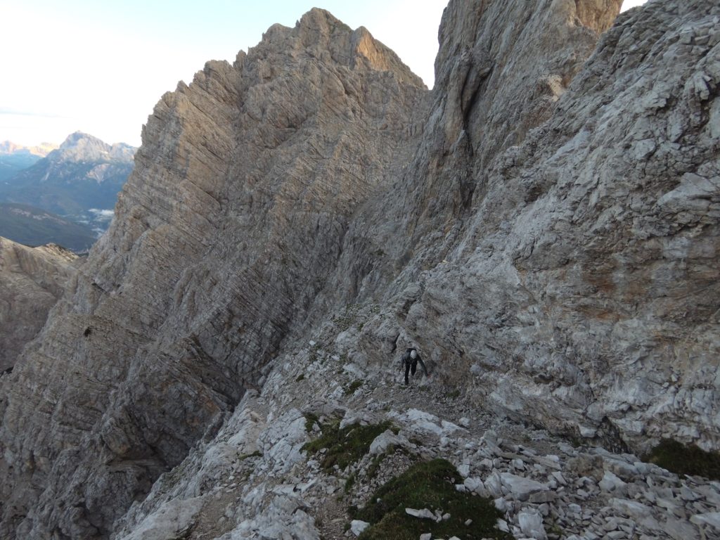 Passata un’ora è arrivato il momento di muoversi. Il sole non è ancora sorto, ma noi siamo già in cammino verso la parte settentrionale della lunga cresta che ci sovrasta. Superati alcuni ripidi prati e canaloni notiamo l’evidente foro che segna l’attacco della Via dei Triestini.