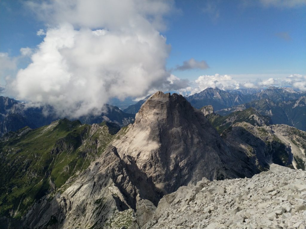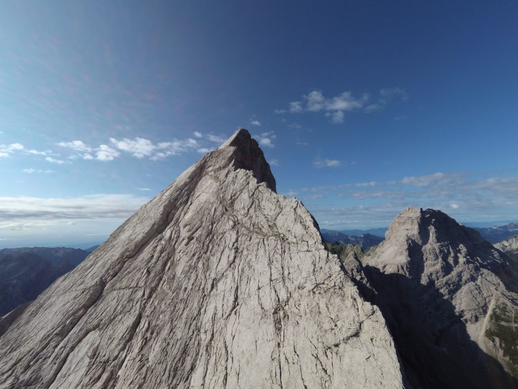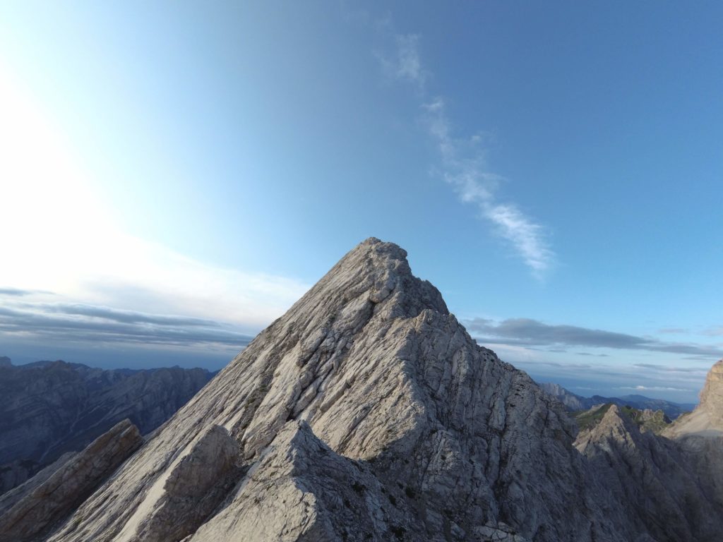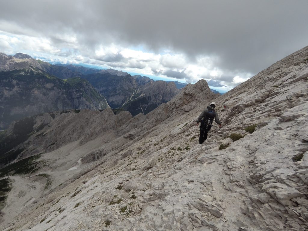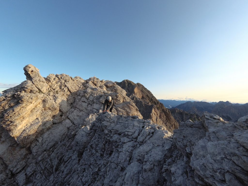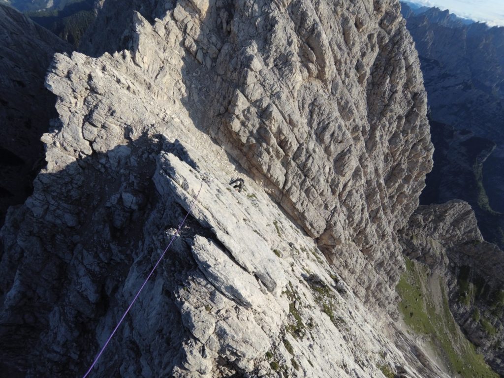 Ridisceso l’ennesimo canalino ci troviamo di fronte ad una bellissima vela di roccia compatta che si staglia nel cielo come una pinna di squalo: è ora di legarsi. Creata una sosta iniziamo a salire prima sulla bianca placca e poi sulla cresta. Alternando tratti di arrampicata più sostenuta a tratti in cui procediamo in conserva arriviamo al passaggio più impegnativo della via.