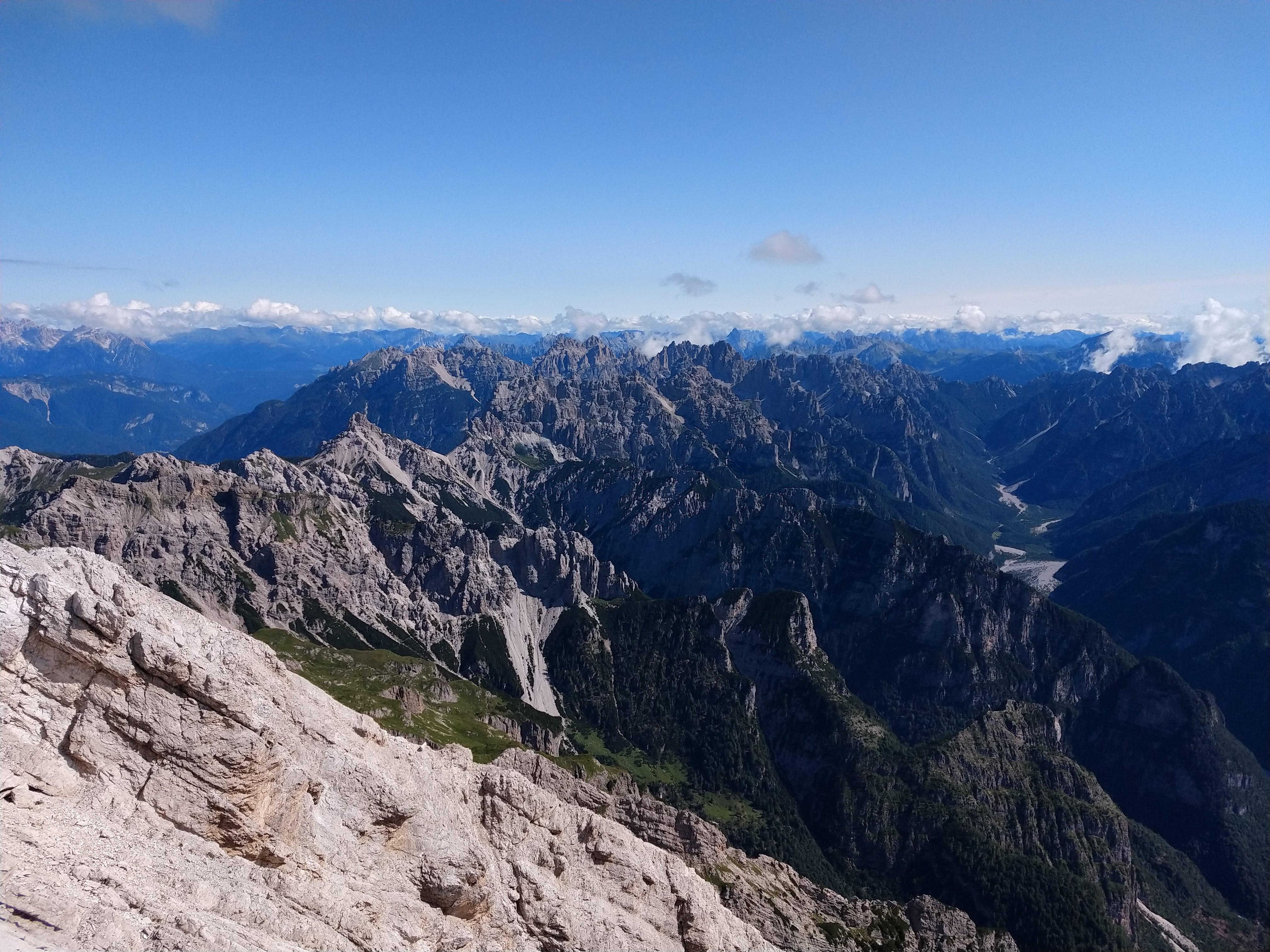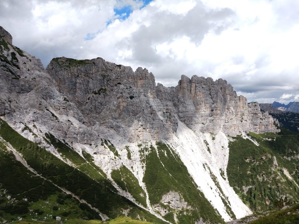Conquistiamo finalmente il punto più alto del nostro percorso dove possiamo sederci e riposare. Il sole splende e la visibilità è ottima: la vista può viaggiare dai vicini Monfalconi, Marmarole, Splati di Toro fino alle Giulie a Est mentre a Ovest i massicci del Pelmo, Antelao, Cristallo e delle altre Dolomiti si fanno guardare in tutti i particolari.