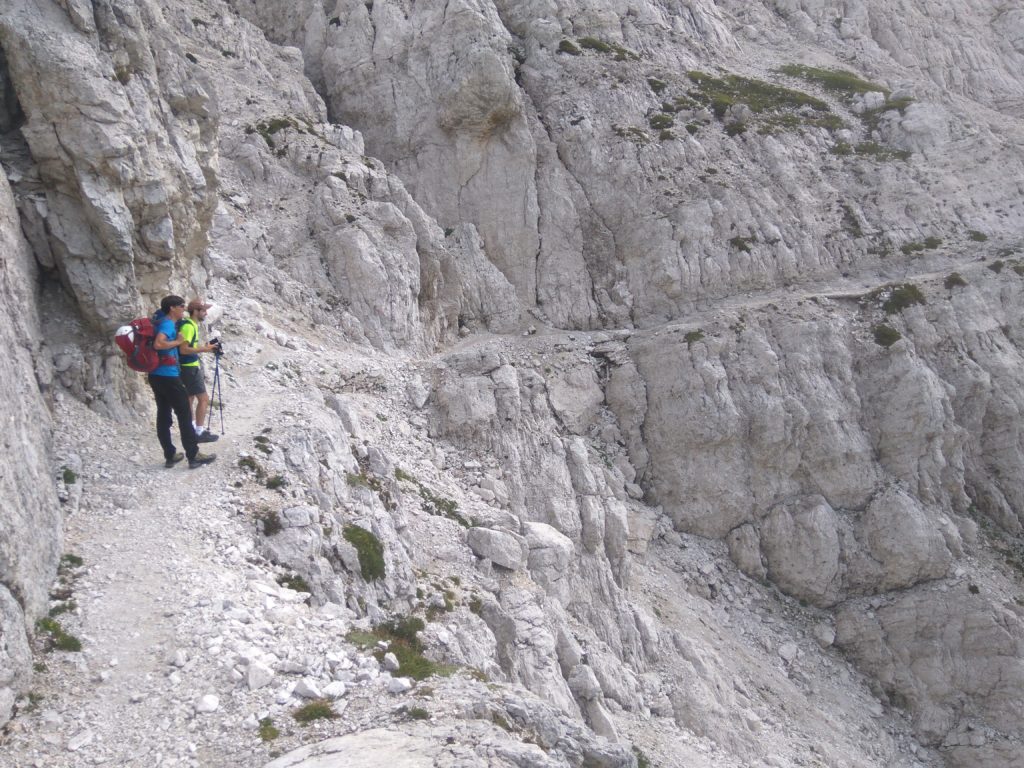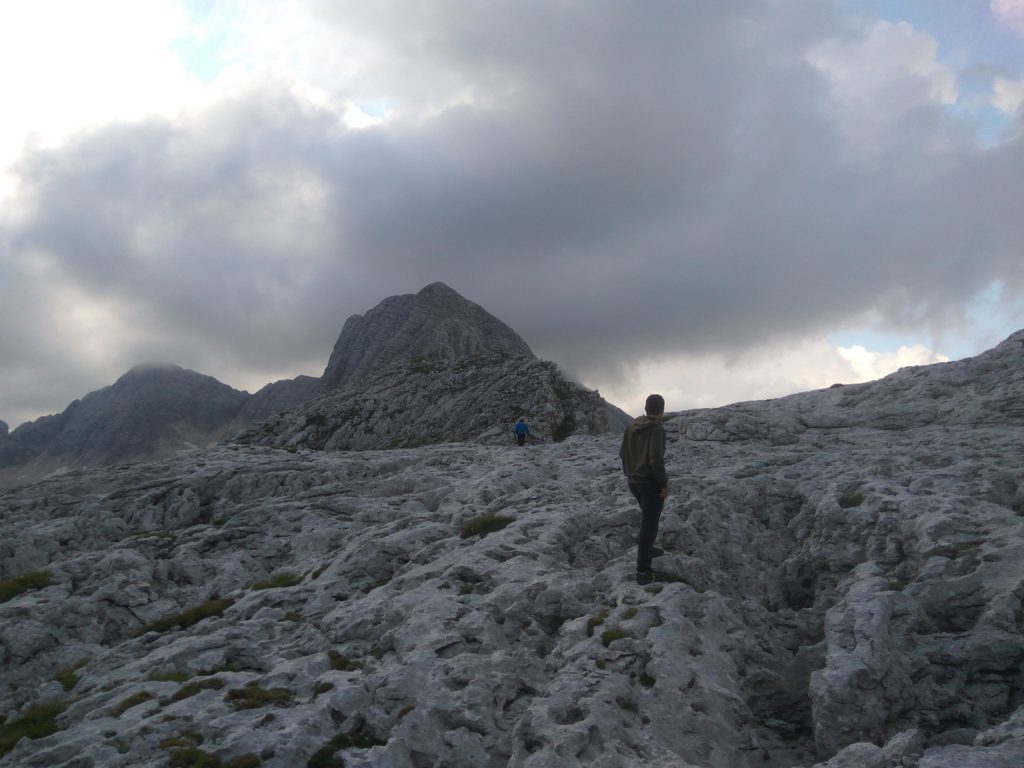 Finalmente è ora di camminare; saliamo in poco tempo i 300m di dislivello fino a Sella Bila Pec dove si trovano i resti di un ospedale militare e guardiamo i pochi km di sali e scendi che ci separano dal Bivacco Marussich e che percorriamo senza rendercene conto tra discorsi di arrampicata e aneddoti di Ambro.