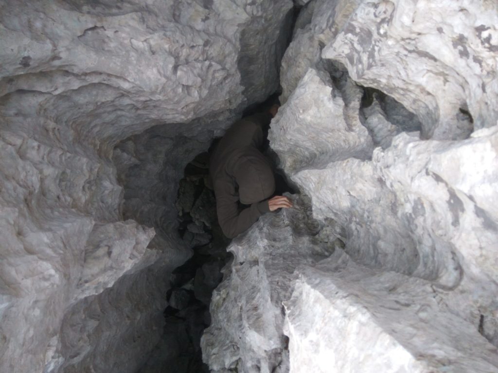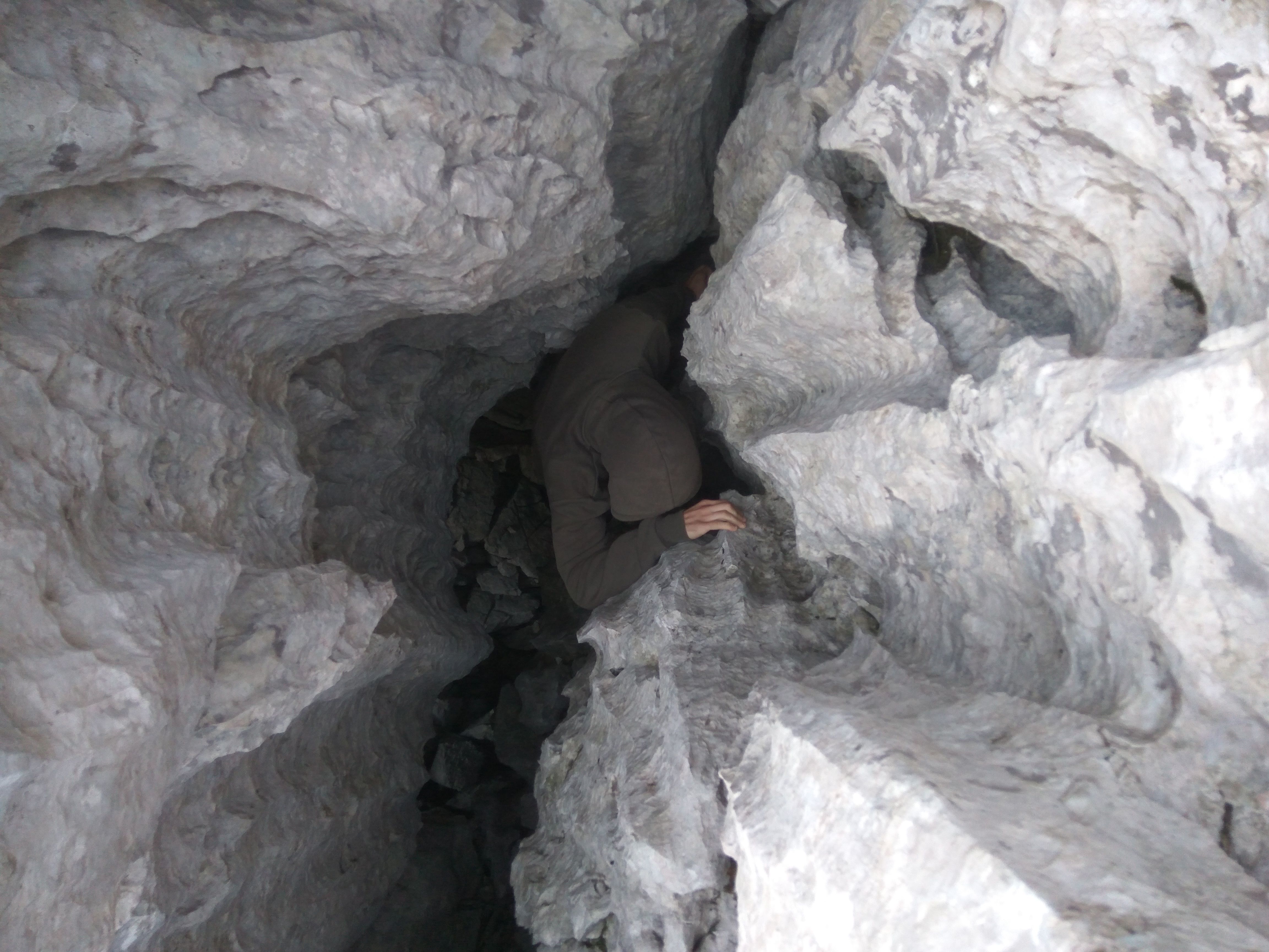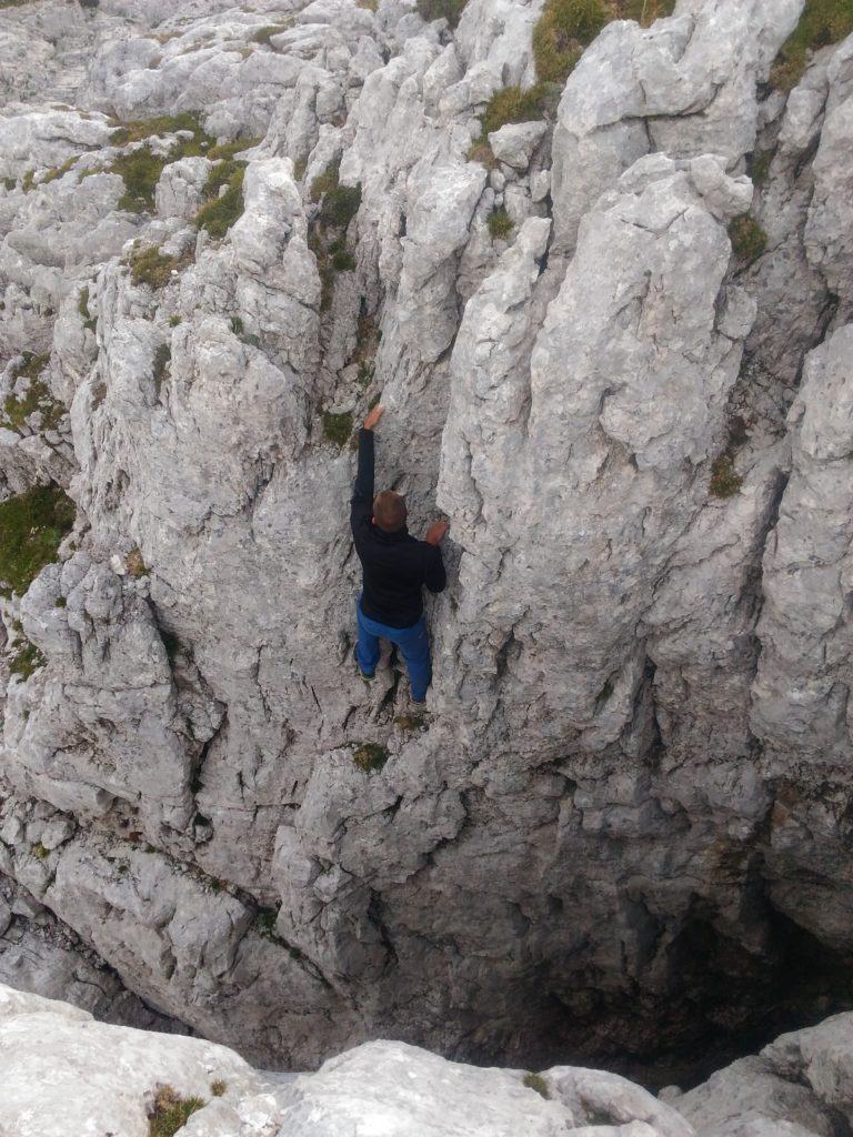 Arriviamo al bivacco in poco più di un’ora dal rifugio e trascorriamo le successive ore divertendoci ad esplorare il Foran dal Mus che con i suoi campi solcati, inghitottitoi e grotte sembra un parco giochi per speleologi. Ci infiliamo nei vari passaggi e strettoie originate dalla dissoluzione dell’acqua sui calcari del massiccio e arrampichiamo in qualche bel camino. Attorno a noi vige il silenzio, rotto solamente da alcuni giovani stambecchi che giocano a prendersi a cornate.