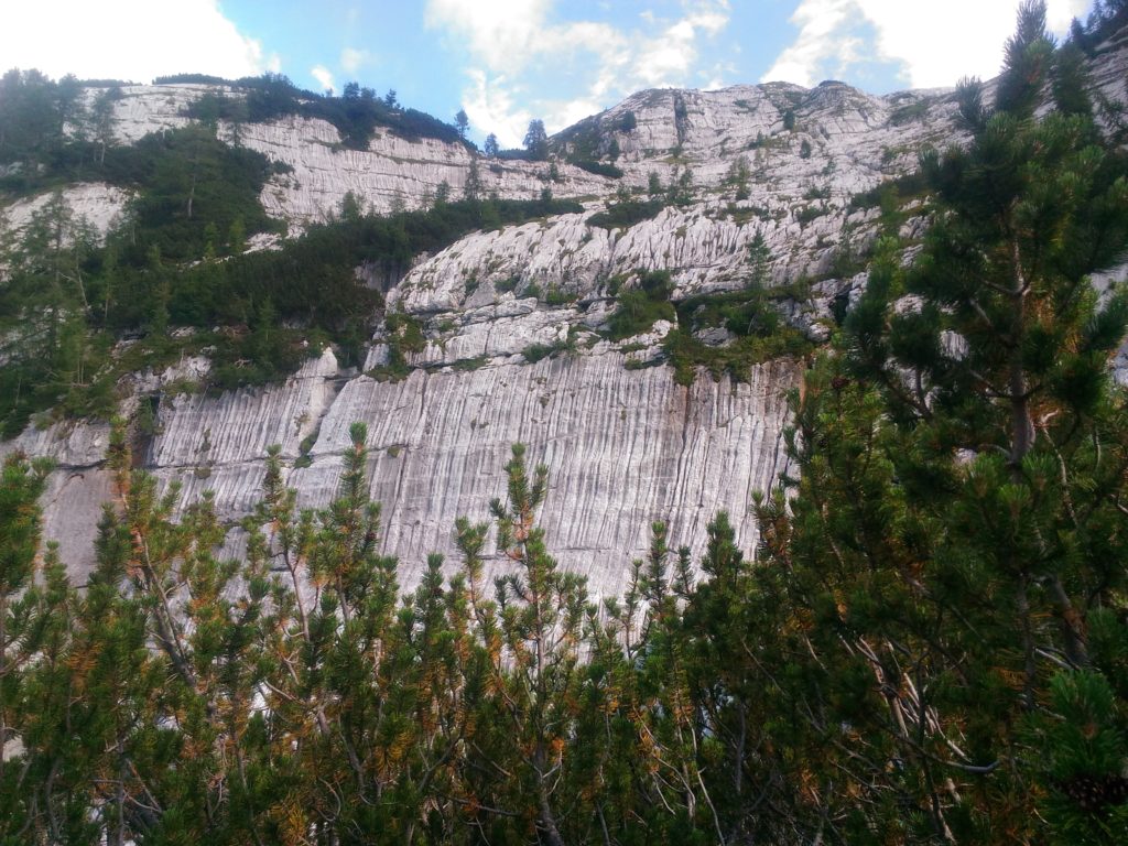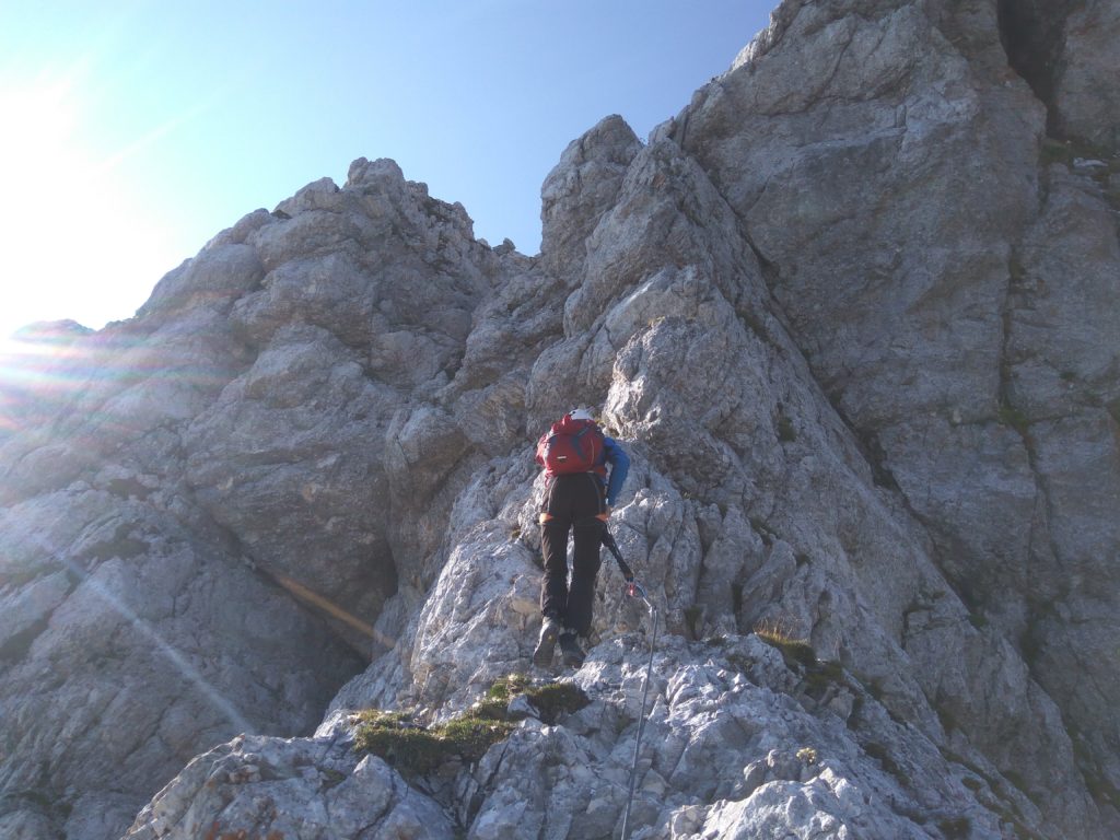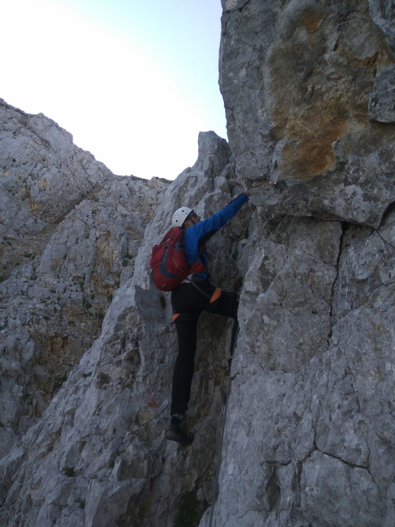 La prima mezzora di salita è molto pesante per tutti e tre, forse a causa di un cattivo sonno, ma all’attacco della ferrata dell’Alta Via Resiana siamo ben caldi e inizia il divertimento.