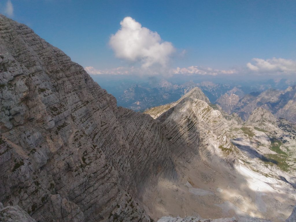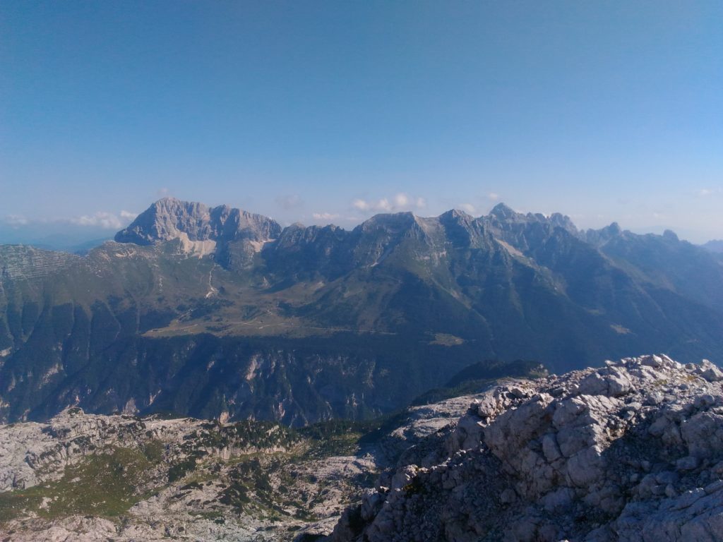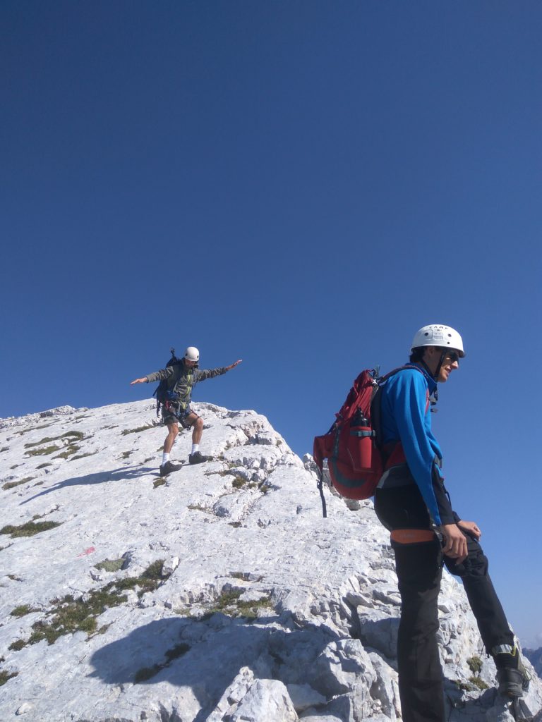 La ferrata si inerpica sulle cenge rocciose e sulle lame di calcare senza mai risultare eccessivamente esposta, la roccia è anch’essa buona e gli sfasciumi non destano troppo pensiero. Il sentiero regala incredibili scorci  sulla Val Resia a Sud e panoramiche sul massiccio del Montasio a Nord.  Passando per il Picco di Carnizza, raggiungiamo la cima del Monte Canin in circa 2h e ci fermiamo un poco per riprendere le energie e mangiare qualcosa. La vetta è piuttosto affollata, numerose sono le persone che salgono in vetta percorrendo la ferrata Julia oppure il sentiero che attraversa il lato sloveno del massiccio, questo però non ci impedisce di godere del panorama.