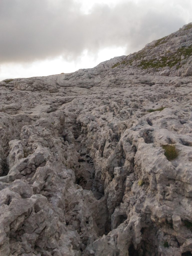 Arriviamo in quattro e quattrotto al parcheggio dell’impianto di risalita del monte Canin, e altrettanto velocemente al rifugio Gilberti in Conca Prevala. Lo spettacolo è subito maestoso, erano anni che non venivo qui, la parete Nord del Canin si staglia imponente contro il cielo e nei dintorni si vedono già gli inconfondibili segni del carsismo nell’area, motivo che la rendono cosi affascinante ai miei occhi.