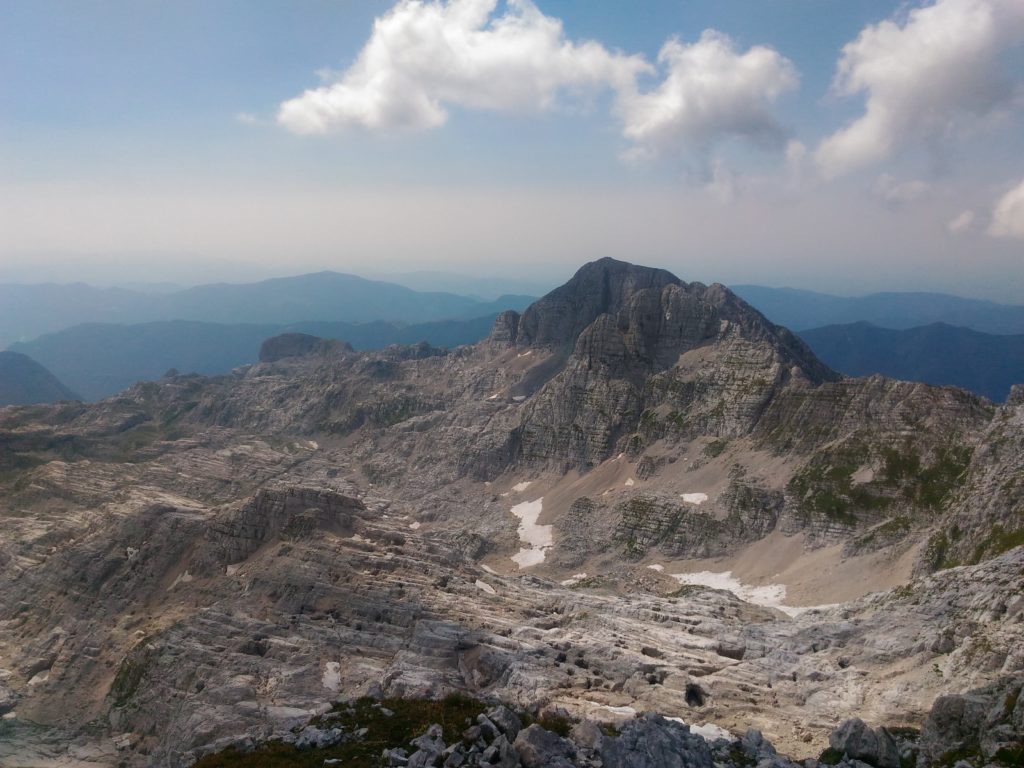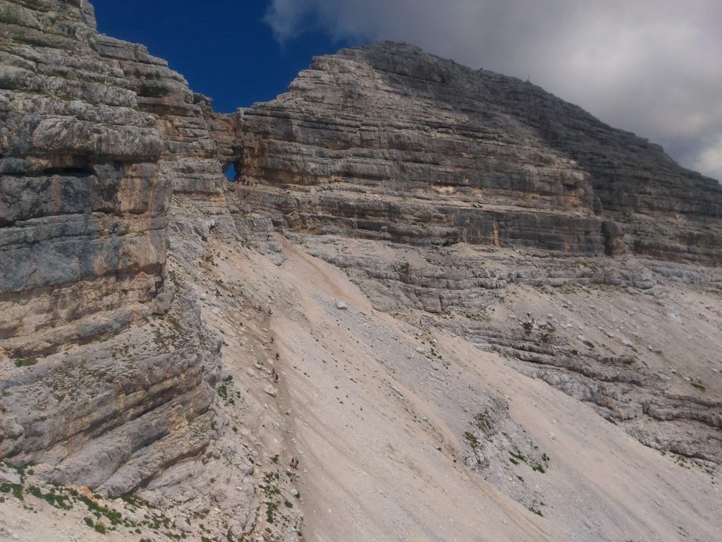 Dopo un’ora circa siamo finalmente di fronte al celebre foro che dà il nome al monte; si vede proprio che siamo di domenica: una lunga processione di persone sale e scende dal grande buco. Decidiamo lo stesso di raggiungere la grande finestra dalla quale poi scendiamo rapidi correndo lungo i ghiaioni fino agli impianti di risalita del complesso sciistico di Bovec.