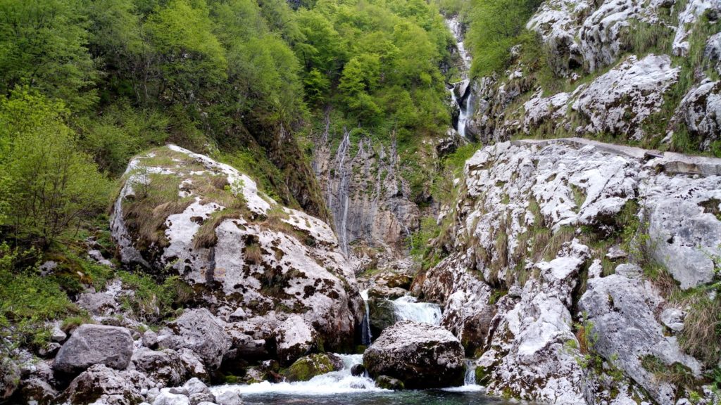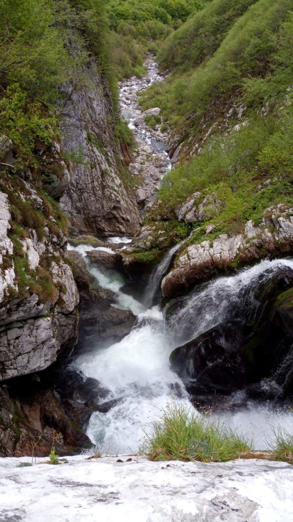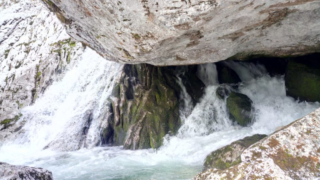 Affascinati dall’ambiente circostante che ci fa sentire così piccoli e fragili in confronto alle forze che muovono tutta quest’acqua, parte quell’irrefrenabile istinto che mi porta a saltare e arrampicare sui sassi per assaporare ogni scorcio, dettaglio e segreto che impregna questa cascata. È così che, in mezzo alla confusione dell’acqua in uscita, trovo una piccola pozza di pace. Una fessura da cui sgorga acqua limpidissima, di quella sfumatura che solo chi conosce i torrenti delle Giulie può figurarsi. Mi immagino essere una piccola molecola o un piccolo abitante dell’oscurità e di poter entrare in quella fessura per scoprire cosa si cela all’interno dei Musi, in una sorta di moderno “Viaggio al centro della Terra”.