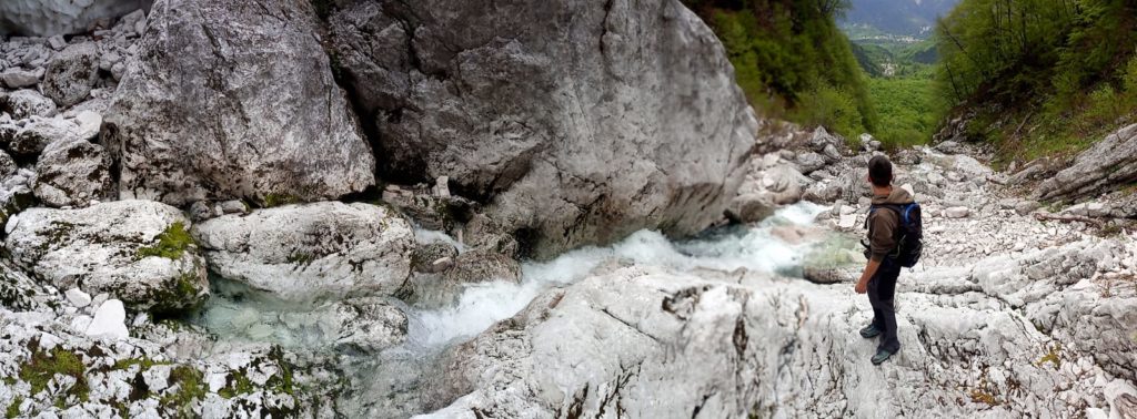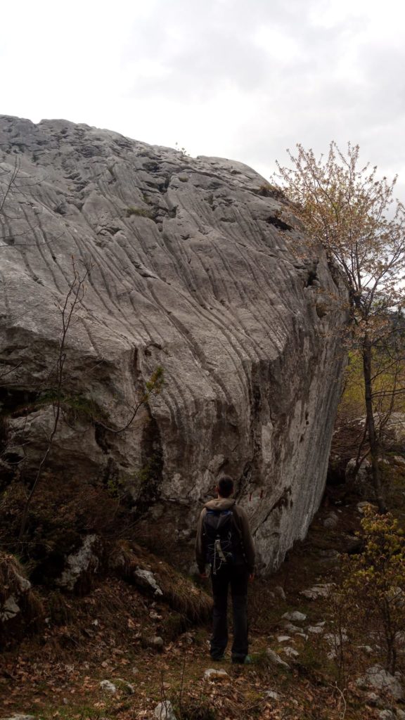 Arrivati ad un bivio abbandoniamo il sentiero CAI 703 per prendere a sinistra un’altra traccia che prosegue sempre verso Casera Planinizza di cui ormai non si vede più che un rudere. Salendo di quota la vegetazione cambia e il fitto bosco di faggi lascia spazio ad altre specie, iniziano a comparire sorbi degli uccellatori, ontani verdi e qualche piccola mugheta. La vista ora riesce a superare il dedalo di foglie e tronchi e spaziare fino all’imponente massiccio del Canin nella parte opposta della valle. Lungo il sentiero che corre in costa incontriamo degli enormi macigni segnati dai solchi tipici che l’acqua incide nel calcare, le cosiddette scannellature, e su cui ci scappa pure qualche tentativo di boulder.