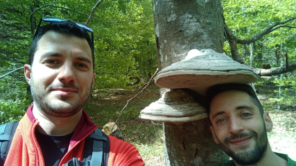 Lungo il percorso ci fermiamo più volte alla ricerca dei Fomes fomentarius., di cui il nostro amico Leonardo è gran appassionato. Questi sono funghi a forma di zoccolo tipici da trovare sui faggi che forse agli occhi dei più appaiono come una maledizione per l’albero ma, sebbene è probabile che ne favoriscano la morte, l’intero bosco con i suoi abitanti beneficeranno di tale dipartita. A questi grandi funghi però siamo legati anche noi uomini da tempi ormai immemori e persino il celebre Ötzi 5000 mila anni fa ne trasportava alcuni, ma a che scopo? Presto detto, sfilacciando la “carne” interna del fungo si ottiene un composto spugnoso chiamato amadou ed è un’ottima esca per accendere il fuoco o per trasportare una brace al suo interno. Dalla combustione non si genera fiamma ma il composto brucia in modo lento e costante generando alte temperature.