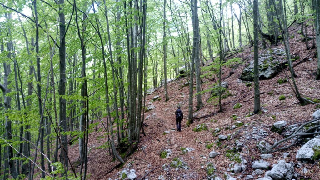 La salita non è mai troppo ripida e la bellezza dell’ambiente circostante la fanno pesare anche meno. I maestosi faggi argentati, le bianche rocce calcaree e il verde del muschio rendono il bosco magico, ogni momento ci si aspetta di veder sbucare un elfo o un folletto. Niente creature mitologiche per noi ma bensì due bellissimi camosci che corrono rapidi lungo il pendio schivando alberi e saltando rocce.